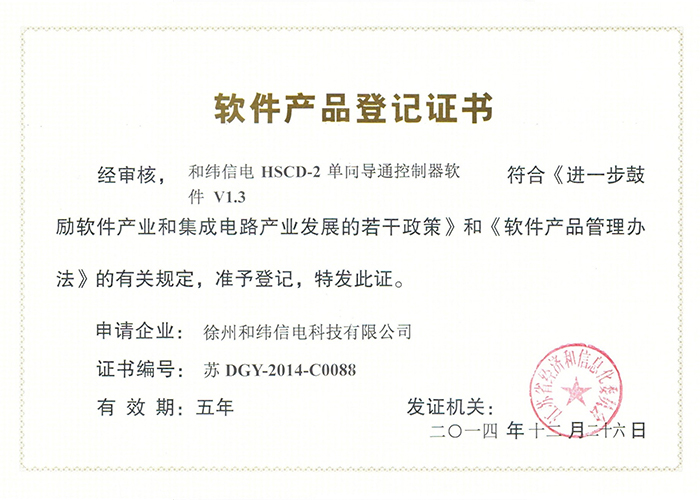 • 10軟件產品登記證書——和緯信電HSCD-2單向導通控制器軟件V1.3